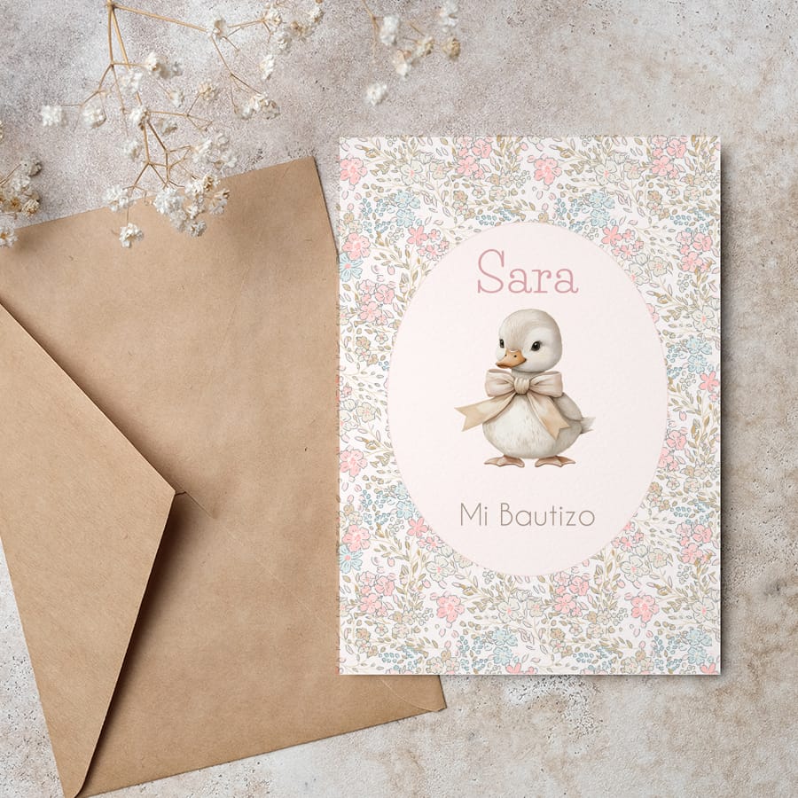 Una invitación dulce y delicada para el bautizo de tu peque. El diseño Patito, con flores liberty y tonos suaves, es ideal para quienes buscan una invitación tierna, elegante y atemporal.