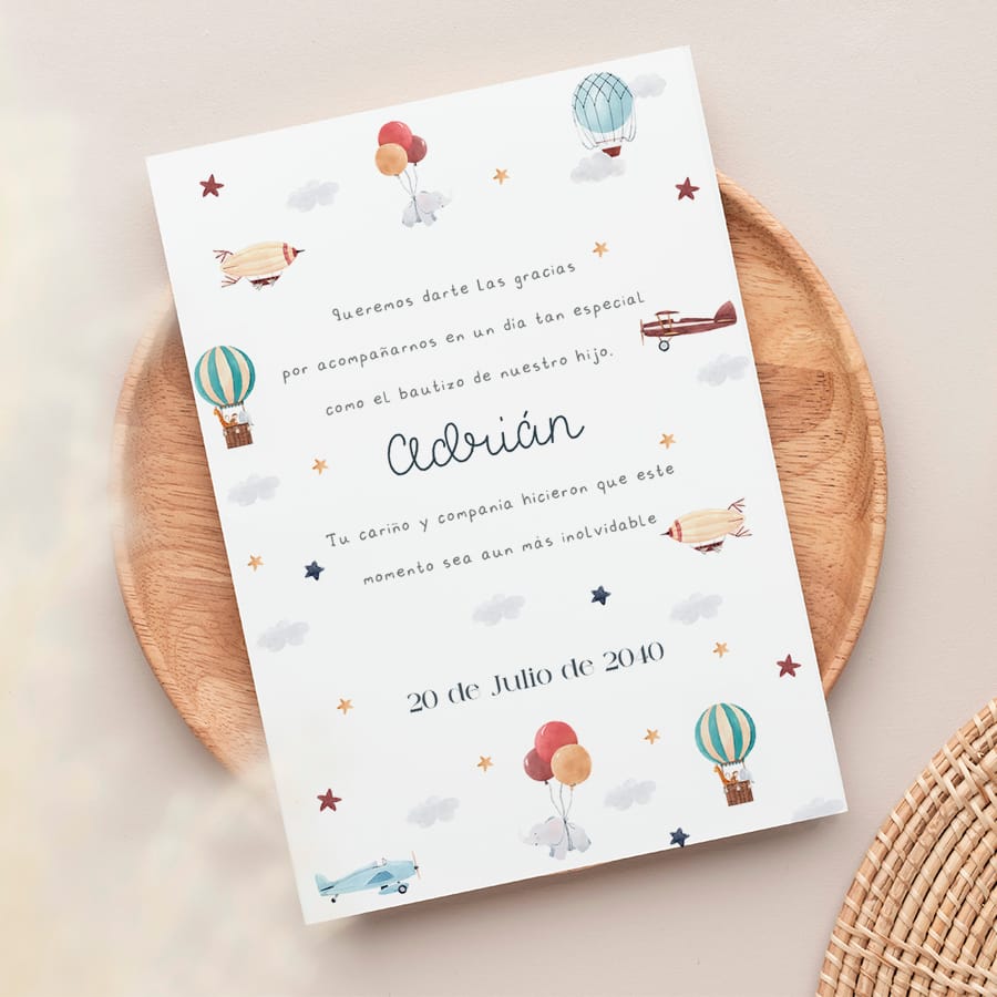 El diseño combina un elefantito con globos aerostáticos y aviones, destacando tonos rojo, azul y amarillo, creando un recordatorio divertido y muy bonito.
