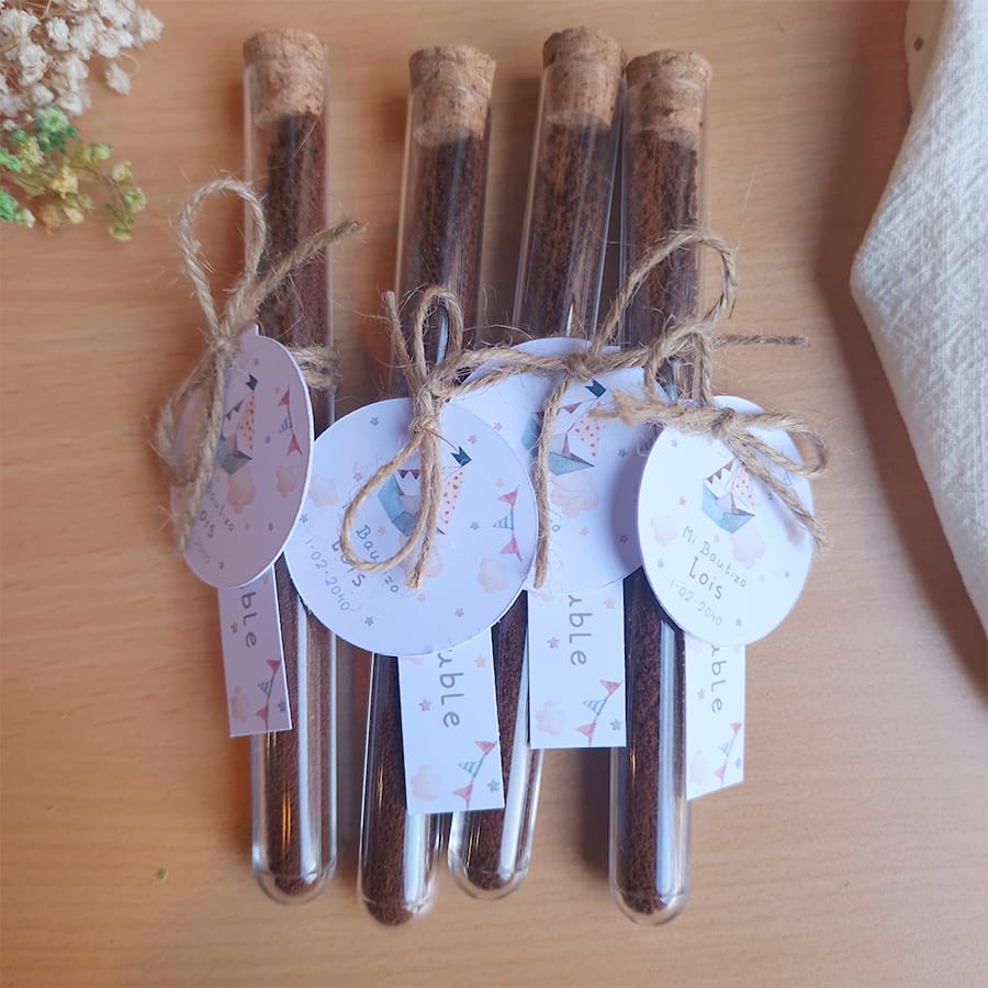 Cada tubito mide aproximadamente 13 x 2 cm y está elaborado con materiales resistentes. Las etiquetas personalizadas se imprimen en papel de alta calidad, logrando un acabado elegante que hará que tus invitados guarden este recuerdo con cariño.