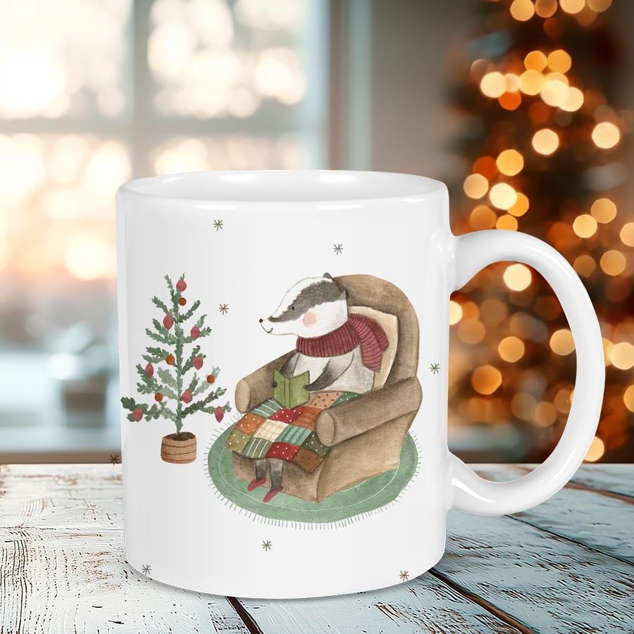 La taza personalizada navideña diseño Tejón es pura calidez invernal. Con un simpático tejón descansando en su sofá junto al árbol de Navidad, transmite hogar, calma y ternura. Perfecta para acompañar momentos de descanso y dulzura durante las fiestas.