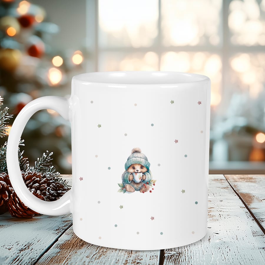Si te encanta la Navidad y el encanto de los pequeños detalles, esta taza personalizada con diseño de erizo navideño te robará el corazón. Un diseño lleno de ternura, con un erizo disfrutando de una humeante taza de chocolate caliente, que transmite calidez y alegría en cada sorbo.