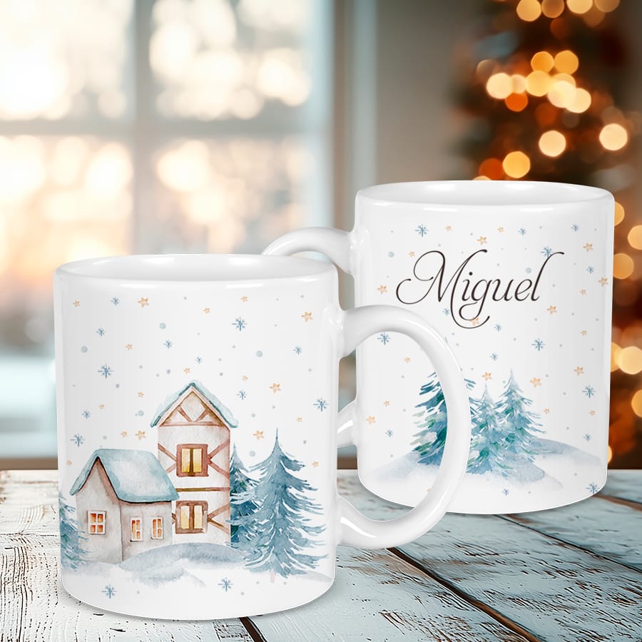 La taza personalizada de Navidad con diseño Casitas Nevadas es puro espíritu navideño. Inspirada en los paisajes cubiertos de nieve, con pinos, casitas y un ambiente acogedor, es perfecta para regalar o disfrutar en casa durante las fiestas.