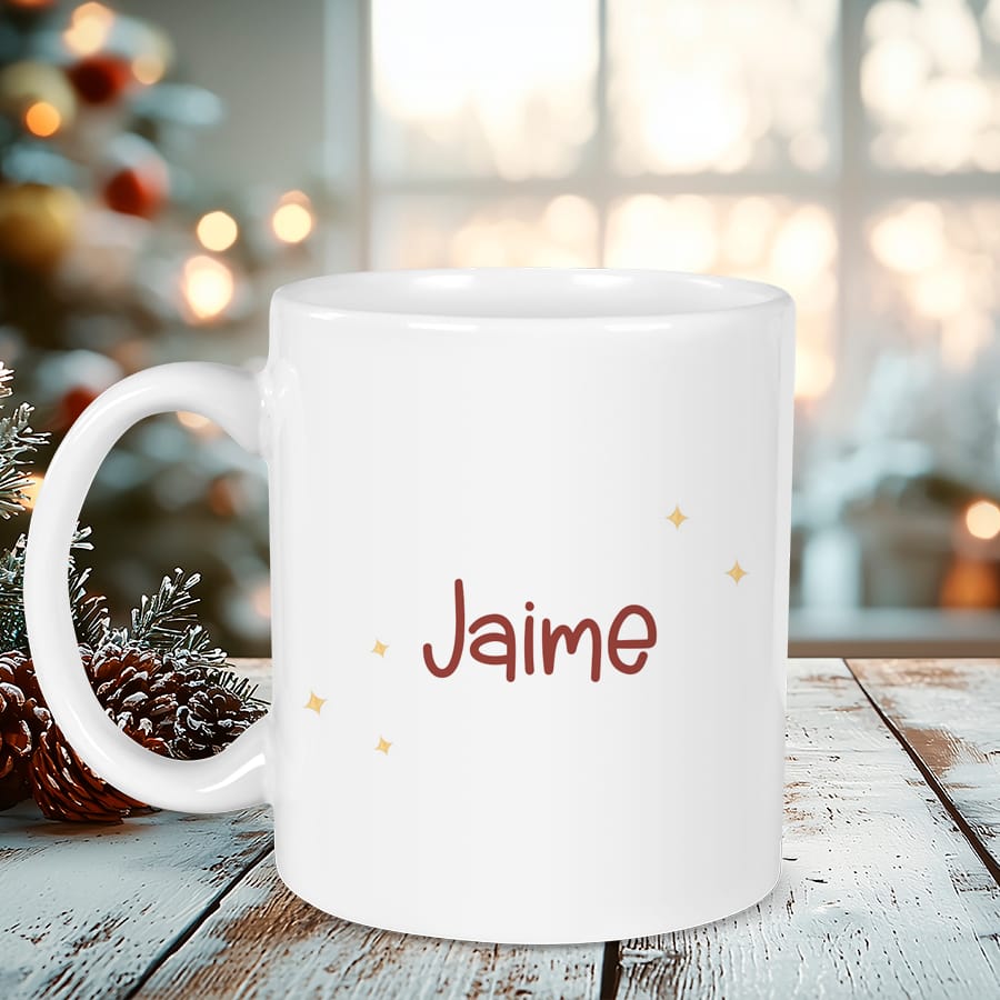 Puedes personalizarla con el nombre que quieras y elegir entre cerámica o plástico libre de BPA. La versión en cerámica es perfecta para disfrutar de tu café o chocolate caliente, mientras que la versión en plástico es ideal para los niños.