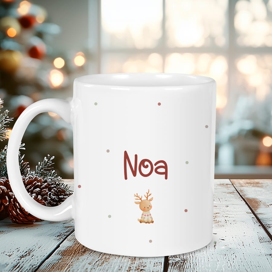 Si te encantan los diseños dulces y el espíritu navideño, esta taza personalizada con reno y árbol de Navidad será tu favorita. Un diseño lleno de encanto y ternura que transmite toda la magia de estas fiestas.