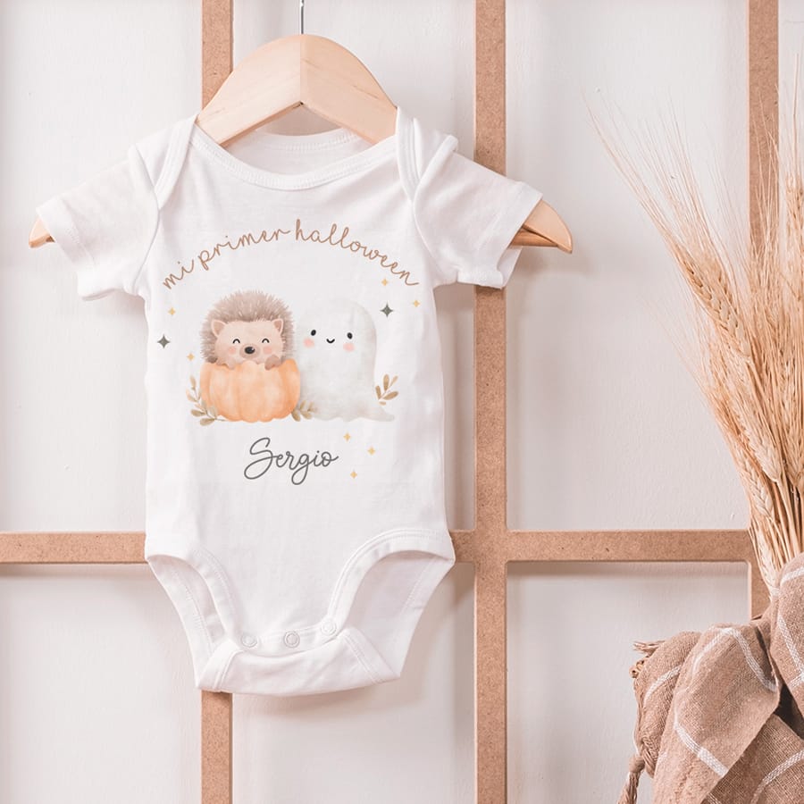 Este adorable body personalizado de Halloween es la elección perfecta para vestir a tu peque en una de las noches más mágicas del año. Con un simpático erizo dentro de una calabaza acompañado de un fantasmita, es un diseño original que transmite ternura y diversión a partes iguales.